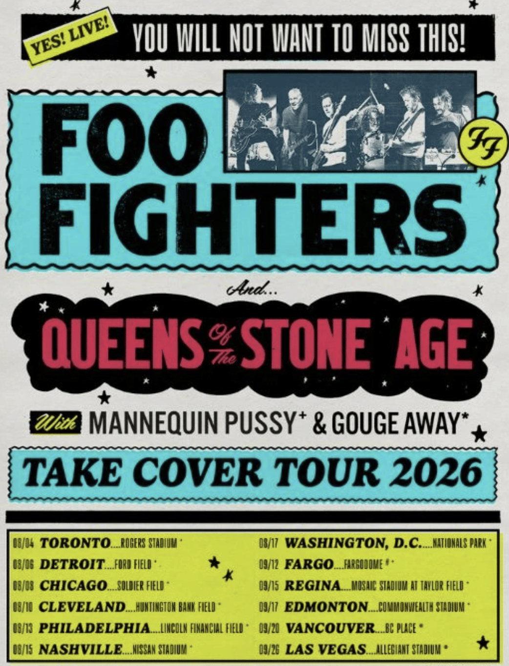 The rock titans unite for a co-headlining stadium run spanning 11 dates from August through September. After releasing new single "Asking for a Friend," Foo Fighters join forces with Queens of the Stone Age for stops at Ford Field, Soldier Field, Lincoln Financial Field, Nissan Stadium, Commonwealth Stadium, BC Place, and Allegiant Stadium. The tour celebrates a 33-year friendship between Dave Grohl and Josh Homme, dating back to their Kyuss/QOTSA collaborations and Them Crooked Vultures. Mannequin Pussy and Gouge Away support on select dates. Newsletter pre-sale begins Oct. 29 at 10 a.m. local, general on-sale Oct. 31 at 10 a.m. local.